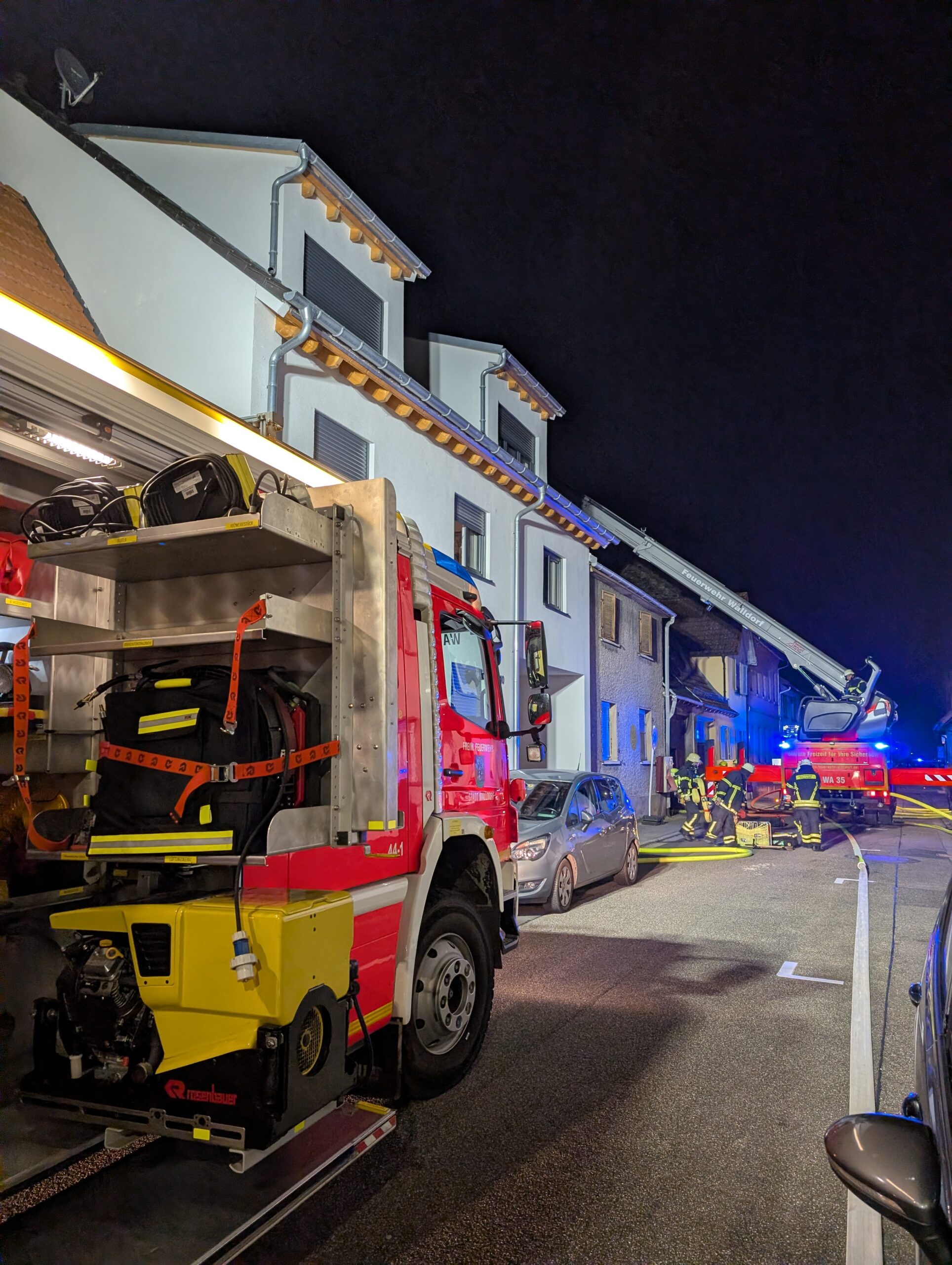 Noch während der Übung zum Thema Brandbekämpfung lief, wurden die Walldorfer Einsatzkräfte zur Unterstützung der Feuerwehr St. Leon-Rot mit dem Teleskopmast sowie Atemschutzgeräteträgern zu einem Brand einer Scheune im Wohngebiet in St. Leon-Rot alarmiert.