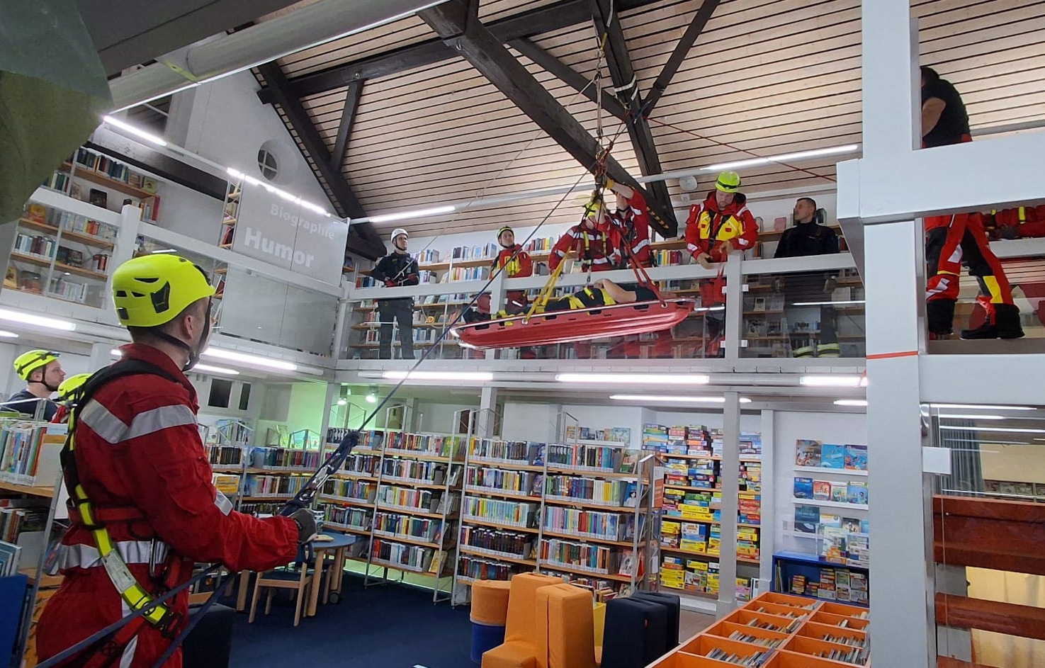 Die Stadtbücherei mit ihren verschiedenen Ebenen und Treppen wurde Anfang Februar für eine Übung der Höhensicherungsgruppe genutzt. Angenommen wurden zwei Situationen, bei denen jeweils eine Person nach einem medizinischen Notfall aus einem höher gelegenen Stockwerk abgeseilt werden musste. Im Einsatzfall erfordern beispielweise enge Treppenhäuser solches Vorgehen, […]