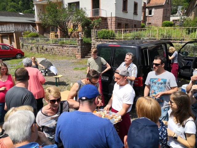 Etwa auf halber Strecke wurde ein Zwischenstopp eingelegt. Schon bei der Einfahrt waren die Tische mit Gläsern zu erkennen. Bei herrlichstem Wetter erwartete uns das Weingut Friedrich aus Hambach und bot eine Weinprobe an. Außerdem wurde die Zeit zu einer kurzen Wanderung hinauf zur Burg Spangenberg genutzt oder um sich die Dampflok nochmals aus nächster Nähe anzuschauen. Anschließend ging die Reise weiter westlich in die Pfalz hinein.