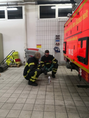Aufgrund des für die Ausbilder bekannten Stoffes wurde in der Übung auf eine umfangreiche Ausrüstung mit Atemschutz oder einem speziellen Chemikalienschutzanzug verzichtet.
