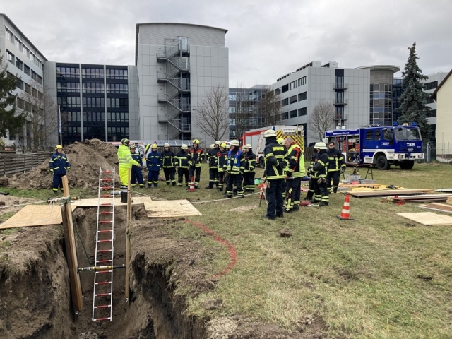 In einer auf zwei Tage aufgeteilten 12h Übung trainierten Rettungskräfte der Feuerwehren aus Wiesloch und Walldorf sowie des THW Ortsverbandes Wiesloch-Walldorf gemeinsam die sichere Vorgehensweise bei Tiefbauunfällen. Szenarien dieser Art sind bei Bauarbeiten oder auch in natürlich gewachsener Umgebung nach Unwettern denkbar. Im vergangenen Oktober unterstützten die Rüstwagen aus Wiesloch und Walldorf bei einer solchen Lage in Malschenberg mit glücklichem Ausgang. Zunächst startete der Lehrgang, der analog des Lehrgangs „Heben und Sichern großer Lasten“ von Heavy Rescue Germany durchgeführt wurde, mit einem Theorieteil und dem Fokus auf die Risiken, die es zu minimieren gilt. Am Folgetag ging es dann mit allen Teilnehmern ins Industriegebiet Walldorf zu einer vorbereiteten Grube, um das Thema praktisch umzusetzen.