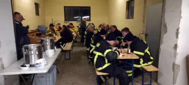 Im Anschluss an die kräftezehrende Übung konnten sich die drei Übungsgruppen mit etwas Glück in letzter Minute vor einem starken Regenschauer unter ein Dach auf dem Hof Frey flüchten, wo die Walldorfer Sondertruppe bereits einen warmen Imbiss zum Abschluss der Übung vorbereitet hatte.