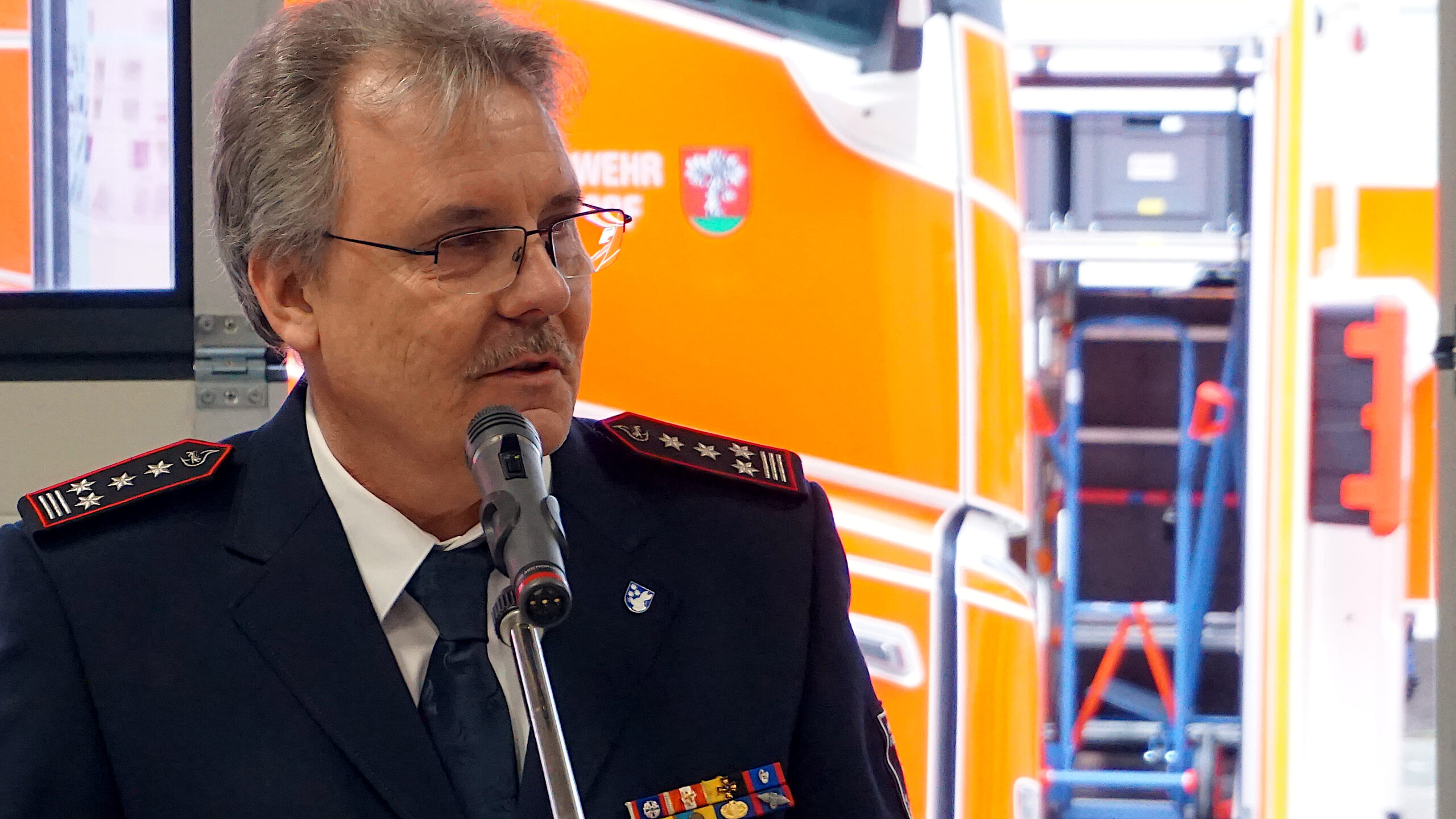 Im Rahmen der Fahrzeugübergabe der beiden Wechselladerfahrzeuge (WLFs) und der sieben Abrollbehälter (ABs) wurde Kommandant Frank Eck von der Stadt Walldorf mit der Bürgermedaille in Silber geehrt. Sie wird verliehen, wenn „ein vorbildliches bürgerliches Gesamtbewusstsein und uneigennütziges idealistisches Handeln im Interesse der Gemeinschaft voraus“ (Ehrungsordnung Stadt Walldorf) besteht. Frank Eck ist seit über 20 Jahren Kommandant der Walldorfer Wehr und sein Name ist eng mit der Feuerwehr Walldorf weit über die Stadtgrenzen hinaus bekannt. Und dennoch mochte er auch an diesem Abend nicht im Mittelpunkt stehen, sollte es doch eigentlich um die Fahrzeugübergabe gehen. So hing Frank die Ehrung nicht an die große Glocke und einige Gäste waren sichtlich überrascht. Doch einig waren sich alle, Frank hat diese Ehrung mehr als verdient. Entsprechend spendeten alle Gäste ihm Standing Ovations.