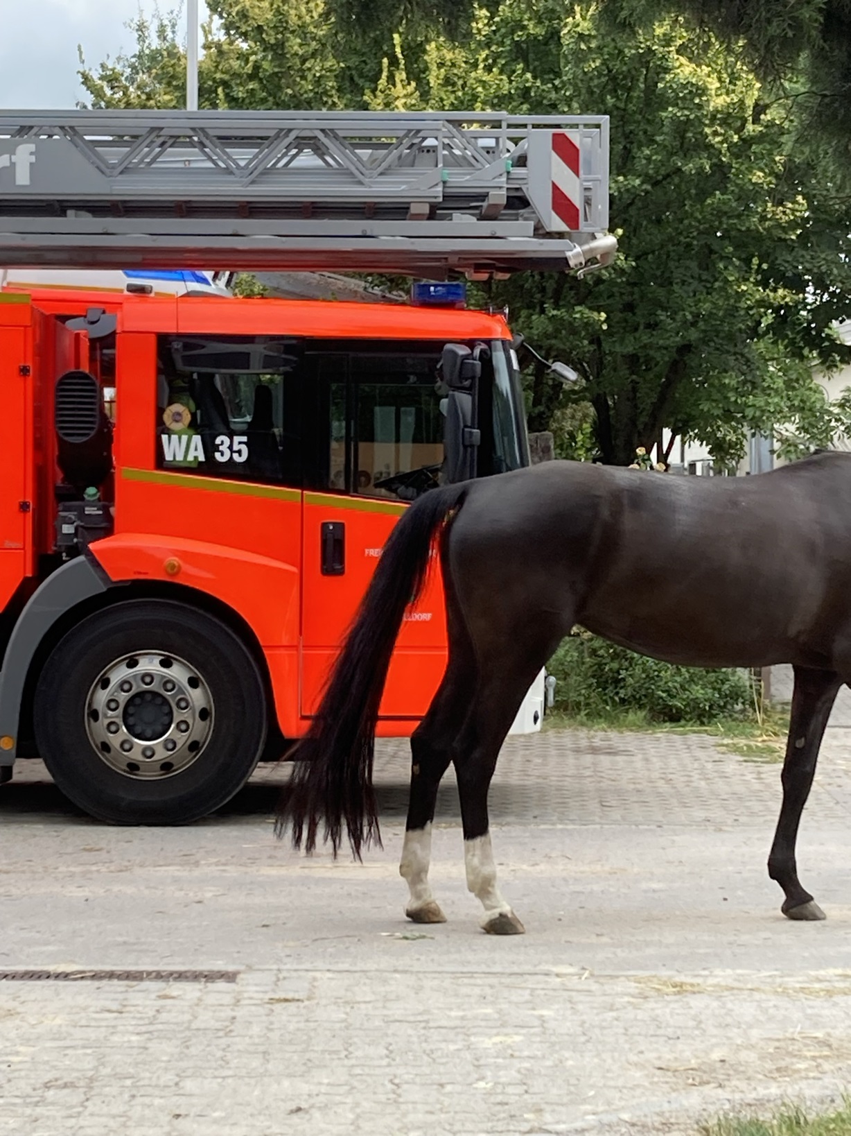 Am 3. August fand eine Führungskräfteausbildung im Gewann Winterheck statt, wo bereits vor einigen Wochen eine Übung zur Wasserförderung absolviert wurde. Denn ein Brandereignis in diesem Bereich beinhaltet neben der Wasserversorgung eine weitere große Aufgabe, die Rettung der dort untergebrachten Tiere. Den wenigsten Bürgern wird bekannt sein, dass sich westlich der Autobahn A5 in mehreren Ställen ca. 200 Pferde und Ponys befinden, die im Falle eines Brandes anteilig evakuiert werden müssten. Nur wie geht man vor, wenn Pferde zügig aus einem Stalltrakt geholt werden müssen, die Zeiten, als Pferde zum Feuerwehrdienst gehörten, aber fast 100 Jahre zurückliegen? Feuerwehrleute können die kniffligsten thermischen und technischen Aufgaben lösen, aber wie überzeugt man ein Pferd davon, dass es die gewohnte Box verlassen und einem Fremden folgen soll?