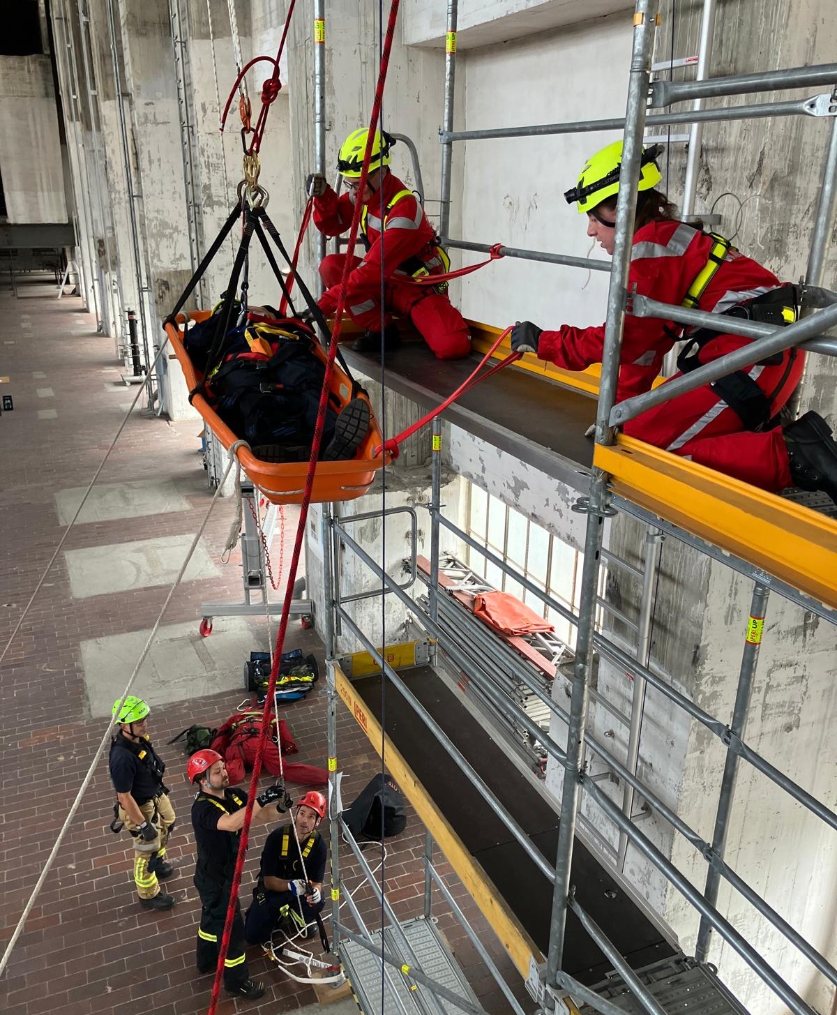 Was in der Vergangenheit nicht so häufig vorkam, ist mittlerweile eine der häufigsten Alarmmeldungen für die Feuerwehr Walldorf. 21 Alarme gingen in diesem Jahr bereits auf das Konto von „Unterstützung Rettungsdienst“ Anforderungen, bei denen entweder die Verfassung von Patienten oder die örtlichen Gegebenheiten einen regulären Transport, beispielsweise durch ein Treppenhaus, nicht mehr zulassen und somit technische Hilfe nötig wird. In den meisten Fällen kann der Korb des Teleskopmasts ein Fenster, einen Balkon oder sonstige Anleiterpunkte erreichen, um Patienten aufzunehmen und auf Straßenniveau zu befördern. Ist dies aber nicht möglich, kommt für die Feuerwehr Walldorf das Einfache Retten aus Höhen und Tiefen zum Einsatz (ERHT), d.h. Transporttragen werden an Seilen abgelassen, oder Verletzte werden aus Gruben nach oben gezogen (siehe auch diese Übung). Um das in spezialisierter Umgebung zu trainieren, trafen sich einige Walldorfer Einsatzkräfte mit einer Gruppe aus Dossenheim und Schriesheim am Übungsgelände der Firma Bornack in Marbach am Neckar. Nach einer Vorbesprechung ging es an die Seile und diverse Szenarien wurden beübt und wiederholt, um die Abläufe zu festigen. Wie schon bei den bisherigen Besuchen in Marbach blieb am Schluss ein positives Fazit und auch diesmal wieder die Erkenntnis, etwas dazugelernt zu haben.