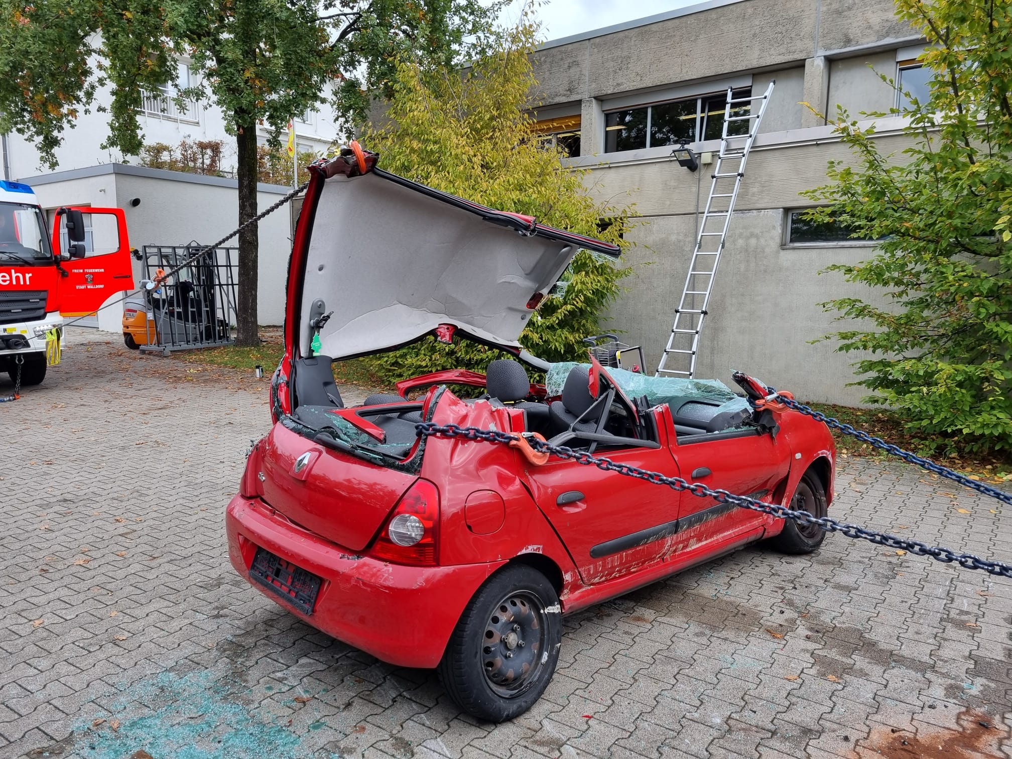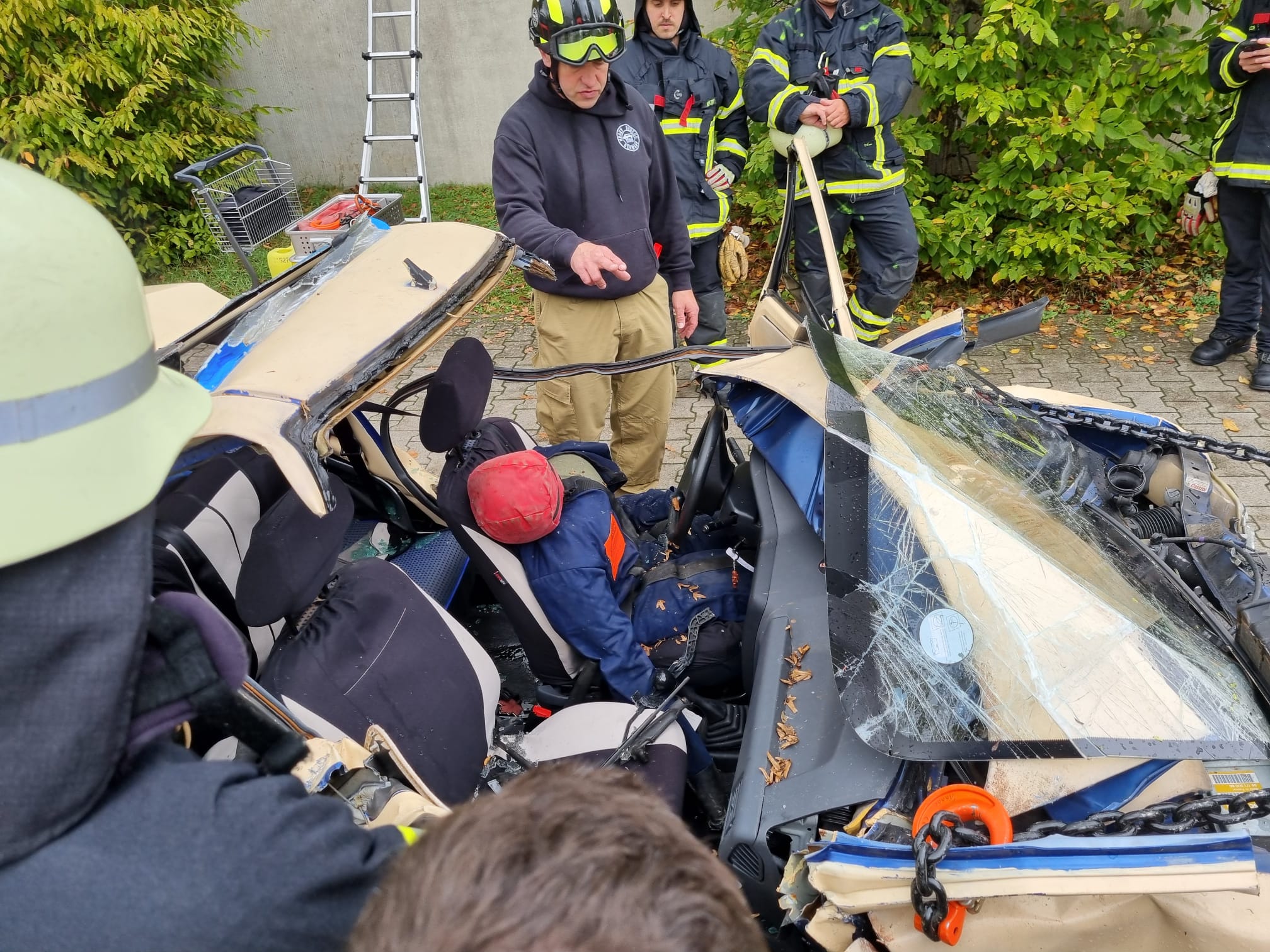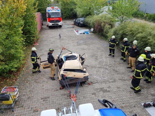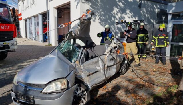 Durch Andreas Schuppe (Schuppe GmbH) mittels Bagger realistisch deformierte Unfallfahrzeuge stellten die Übungsteilnehmer vor verschiedene Aufgaben, die alle zum Ziel hatten, eine möglichst zügige Öffnung zur Befreiung von Personen zu erzielen. Teilweise waren Übungspuppen durch einen frontalen Aufprall im Fußraum eingeklemmt, aber auch ein Szenario mit seitlichem Einschlag gegen einen Baum wurde beübt und anschließend detailliert besprochen. Bei allen Lagen wurden durch gezieltes Anschlagen von Ketten und Zugeinrichtungen (Seilwinde, Mehrzweckzug) die Deformationen so weit zurückgezogen, dass der Zugang zu den Übungspuppen frei wurde. Je nach Lage kann dies schneller erfolgen als mit klassischen hydraulischen Geräten wie Spreizer oder Rettungszylinder. Bei der Nachbesprechung waren sich alle Teilnehmer einig, dass diese neuen Erfahrungen sehr wertvoll sind, um im Einsatzfall ein breiteres Repertoire an Lösungsmöglichkeiten zur Verfügung zu haben. Denn dass dies jederzeit notwendig sein kann, zeigte eine Alarmierung noch während des verdienten Mittagessens, als das Stichwort „Verkehrsunfall – BAB5 in Richtung Karlsruhe“ die Einsatzkräfte zwischenzeitlich in eine reale Lage versetzte (Einsatz 203). Glücklicherweise war keine Rettung von Personen nötig, sodass die Ausbildung am Standort zügig weiterlaufen konnte.