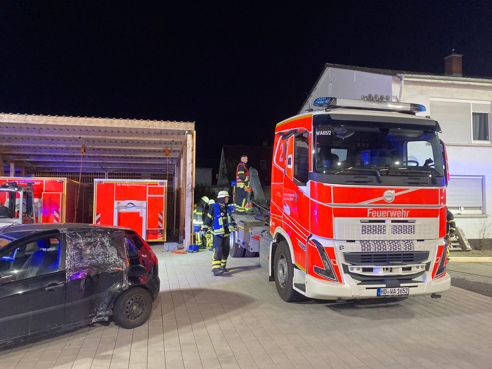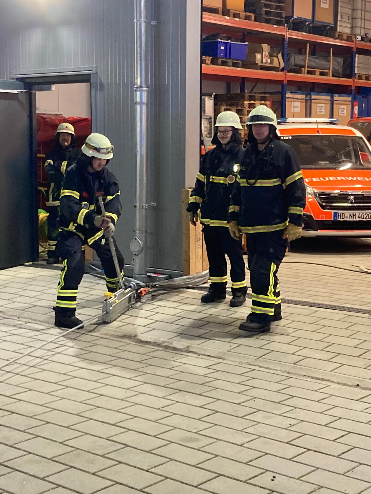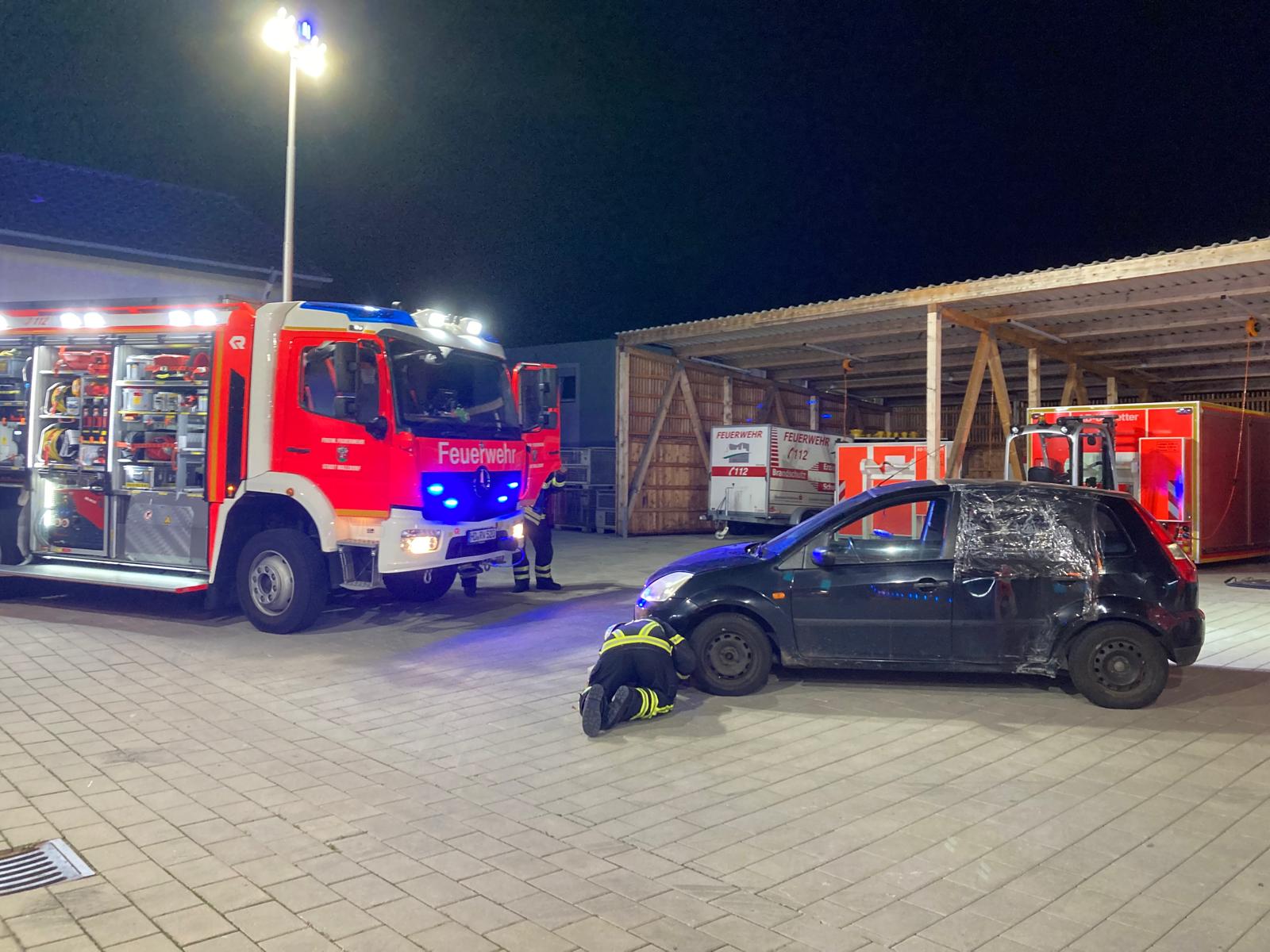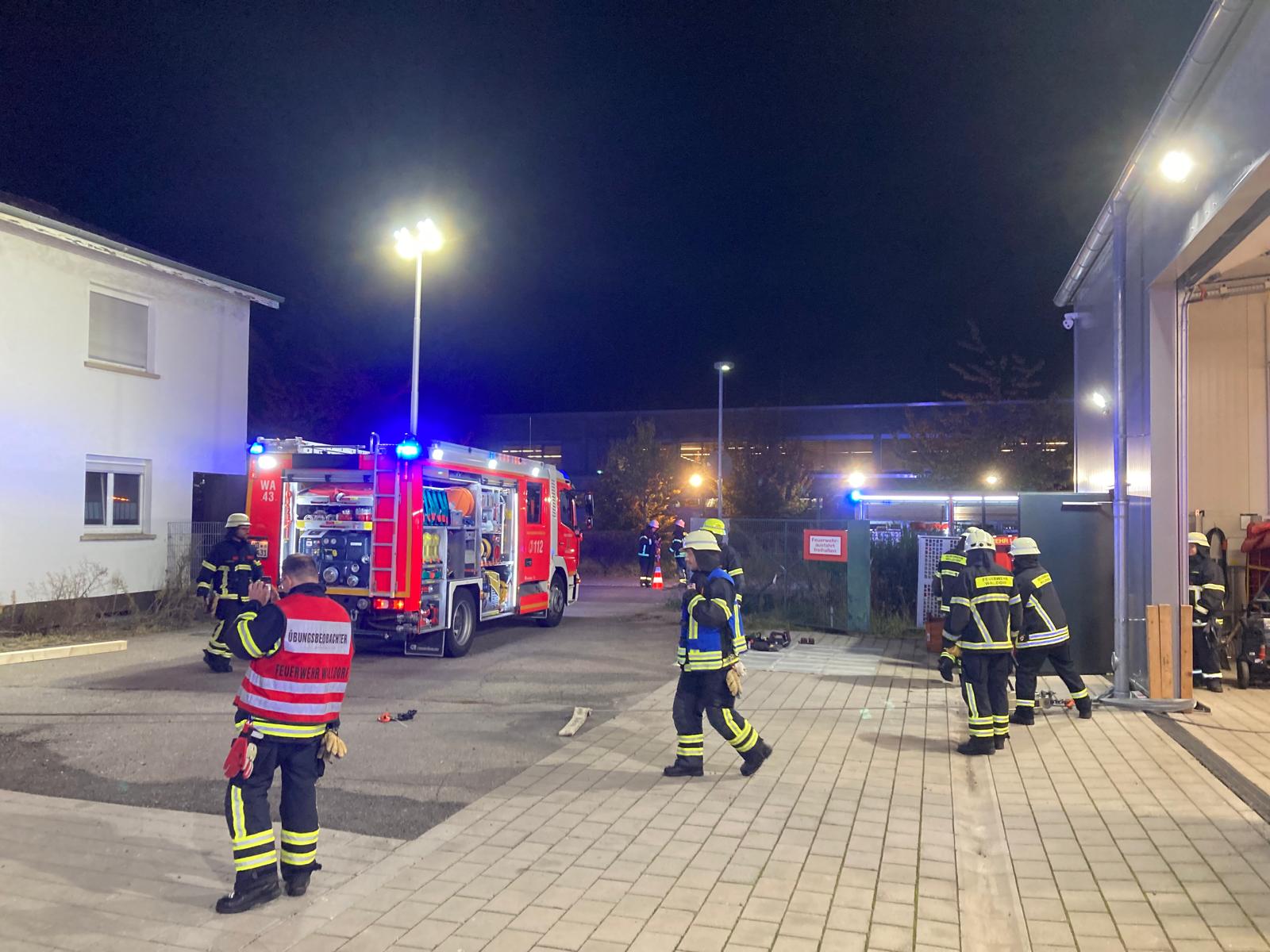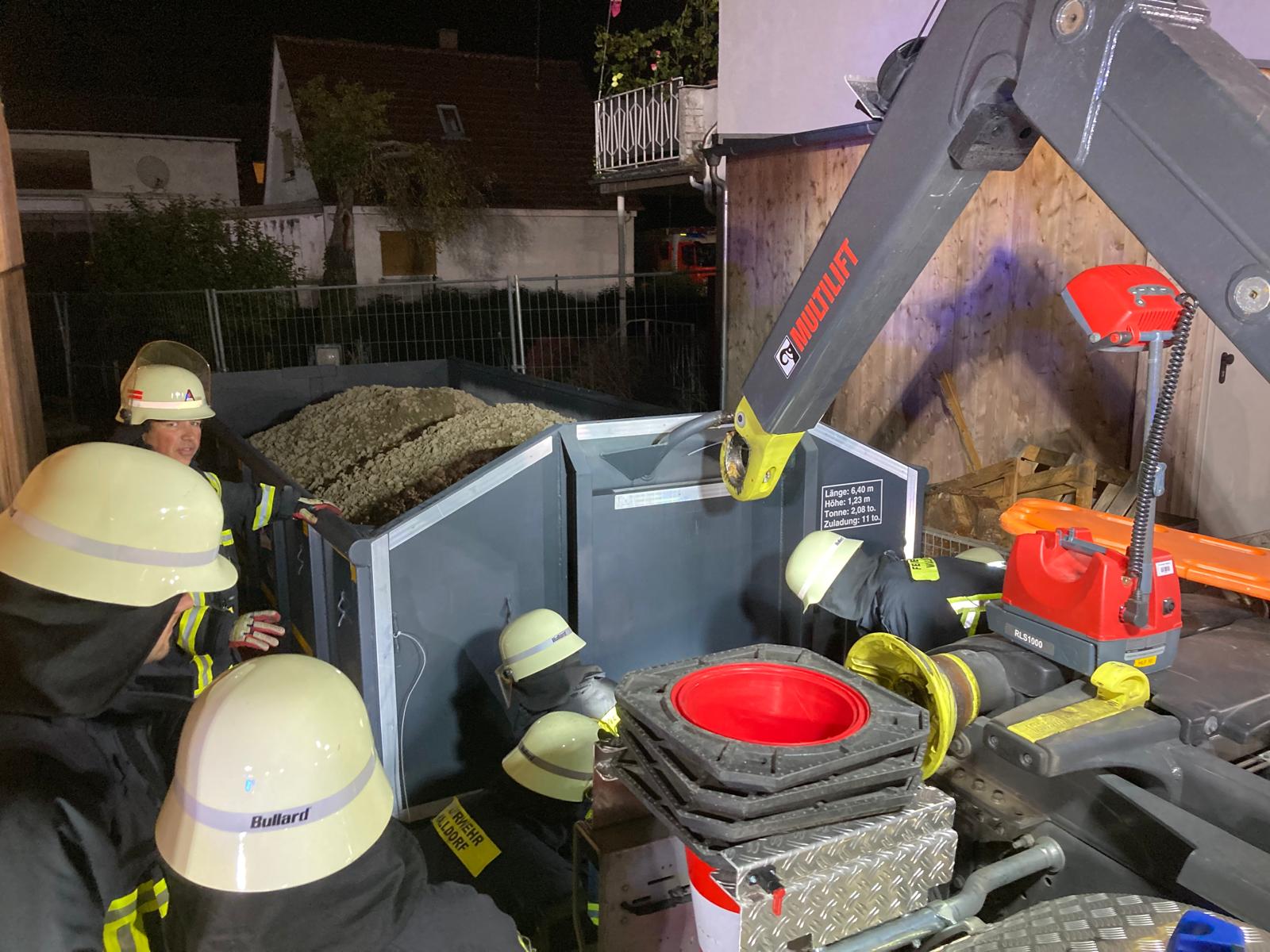 Die Lage sah einen Betriebsunfall auf einem Hofgelände vor, bei dem ein Wechselladerfahrzeug eine mit ca. 8 Tonnen Schotter beladene Mulde abgesetzt hatte. Durch eine Unachtsamkeit auf engem Raum war der Einweiser allerdings unter der Mulde eingeklemmt. Unpraktischerweise war der Bereich durch einen Schrott PKW und einen weiteren Container zusätzlich versperrt, dass ein direkter Zugang für die Feuerwehr erschwert wurde. Die anrückenden Einsatzkräfte wurden durch den Zugführer aufgeteilt und so kümmerte sich die Rüstwagenbesatzung zunächst mit der Seilwinde um den Zugang, der durch den Schrott PKW zugestellt war. Parallel bereitete die Mannschaft des Löschfahrzeugs das Entfernen des seitlichen Containers mittels manuellem Mehrzweckzug vor und die Besatzung des Hilfeleistungslöschfahrzeugs betreute den Patient und brachte sukzessive die Hebekissen zum Einsatz, um die Mulde anzuheben. Alle drei Teilaufgaben liefen parallel und Hand in Hand. Erschwerend kamen die Dunkelheit sowie die Platzverhältnisse auf dem Betriebshof hinzu. Mangels Stellmöglichkeit eigener Anschlagpunkte (Fahrzeuge), wurde improvisiert und auf bauliche Alternativen zurückgegriffen. Nur knapp 40 Minuten nach Eintreffen am Einsatzort konnte der Patient bereits befreit, aus dem zuvor verstellen Bereich gerettet und an den Rettungsdienst übergeben werden.