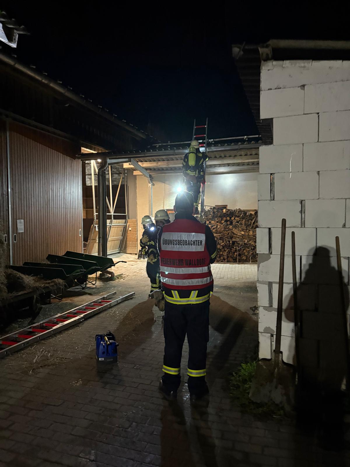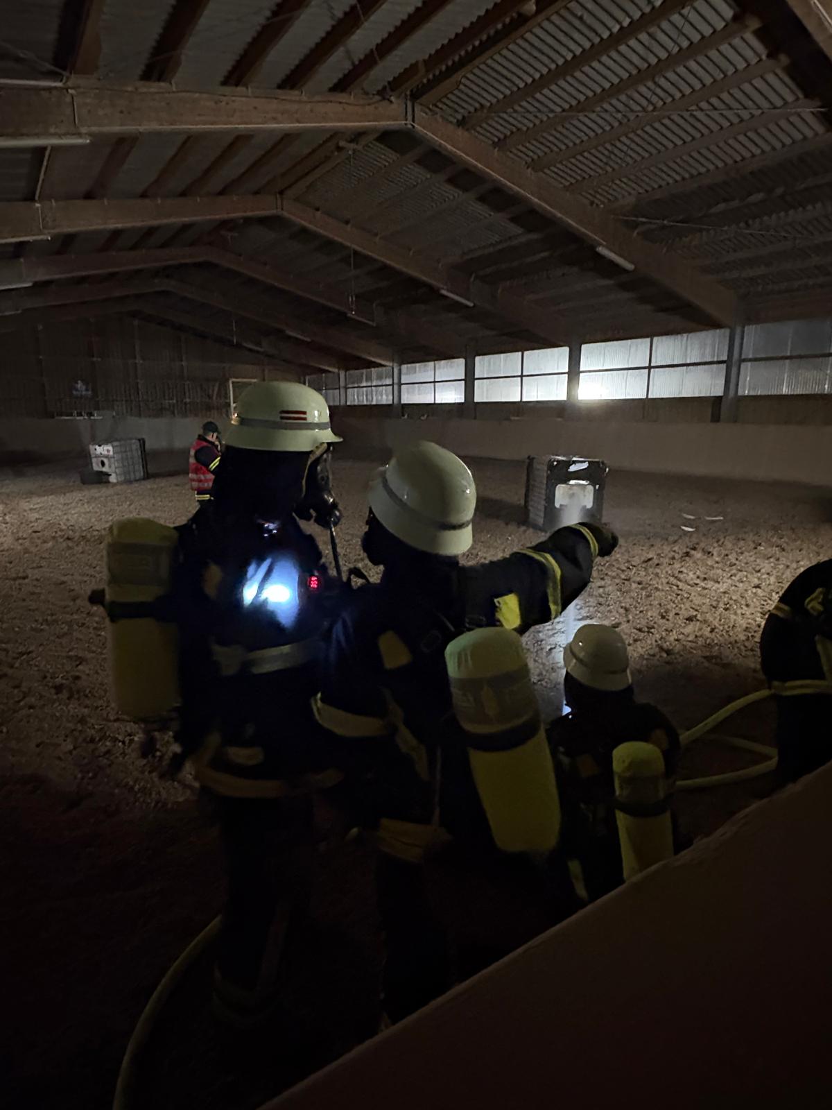 Nach der ersten Lageerkundung stand der Brandherd fest und es wurde ein Löschangriff aufgebaut. Atemschutztrupps führten die Brandbekämpfung im Inneren der Reithalle durch, während weitere Kräfte die Wasserversorgung sicherstellten. Über tragbare Leitern wurde zusätzlich ein zweiter Angriffsweg aufgebaut.