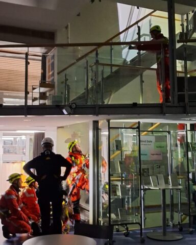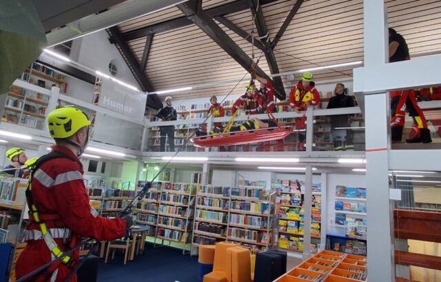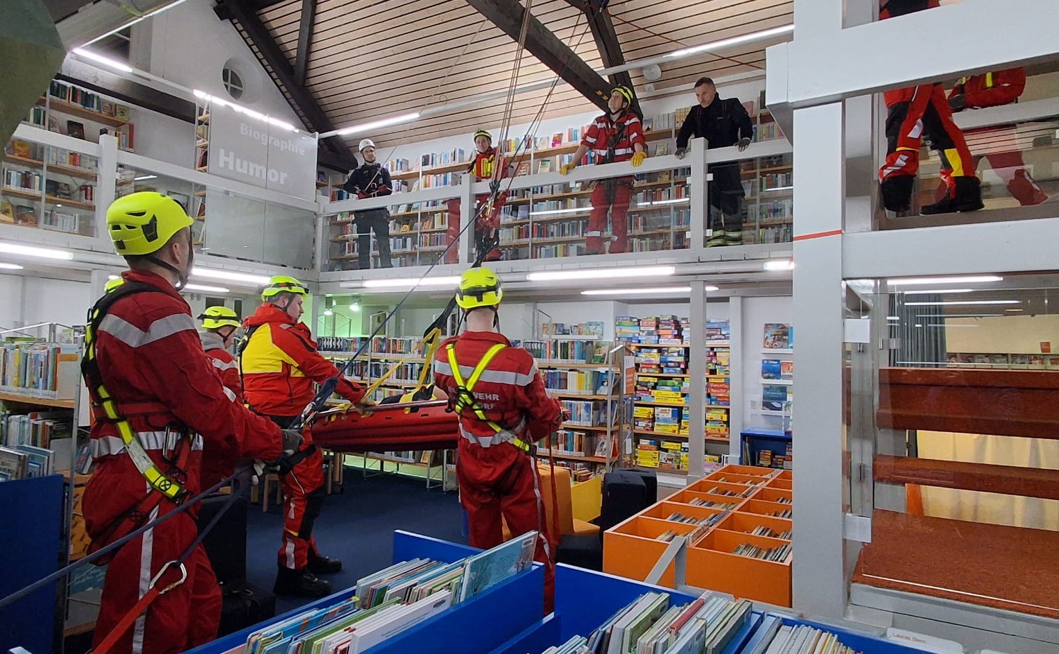 Die Stadtbücherei mit ihren verschiedenen Ebenen und Treppen wurde Anfang Februar für eine Übung der Höhensicherungsgruppe genutzt. Angenommen wurden zwei Situationen, bei denen jeweils eine Person nach einem medizinischen Notfall aus einem höher gelegenen Stockwerk abgeseilt werden musste. Im Einsatzfall erfordern beispielweise enge Treppenhäuser solches Vorgehen, wenn die starre Trage nicht horizontal um Biegungen getragen werden kann.